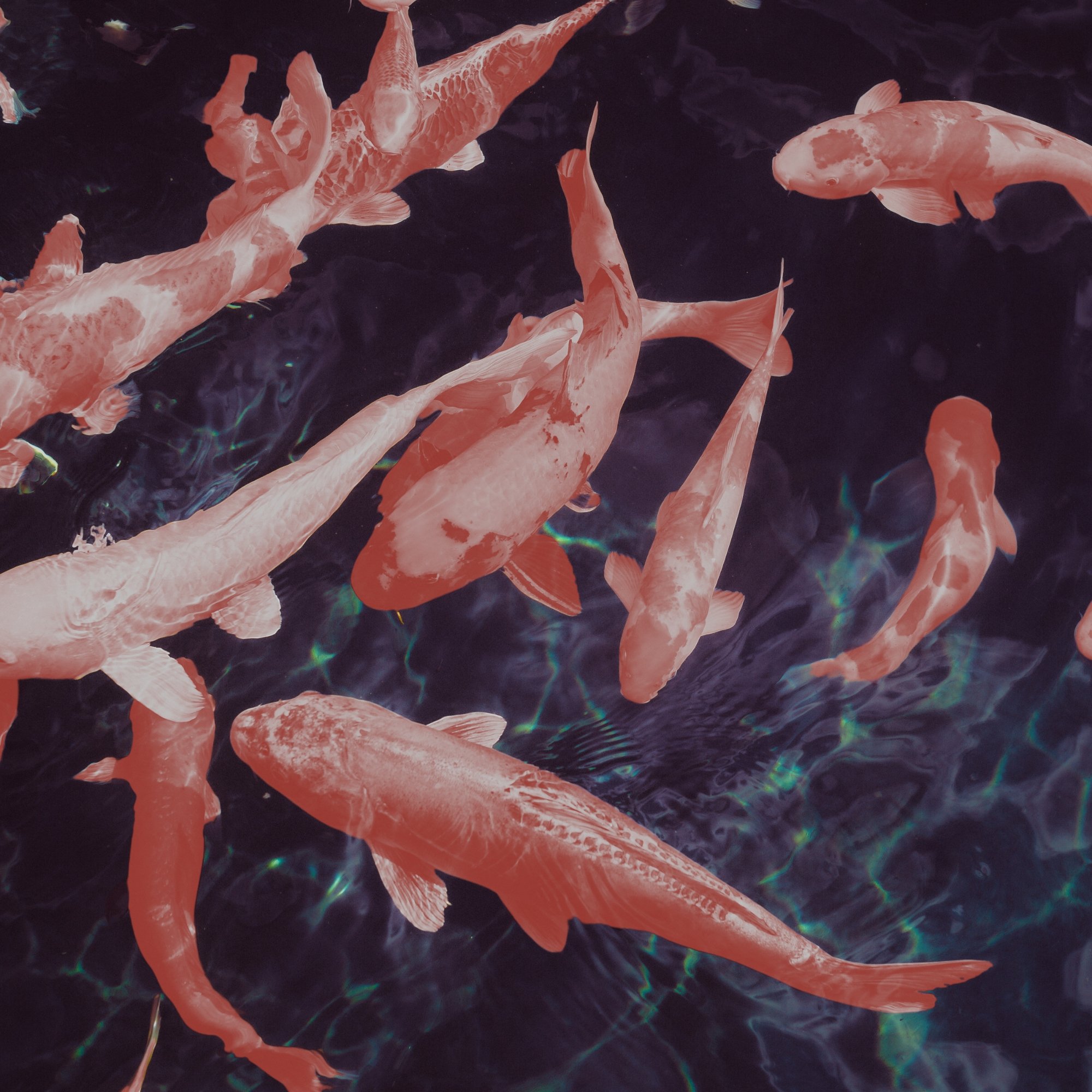 Flashing movement across the room, a dozen little splashes and the glimmer of sleek bodies shooting through the water. I think I’m scaring them. Coins in a fountain, a thousand wishes that never come true, wasted pocket change and valuable time. Miyagi’s koi fish, scattering in all directions.