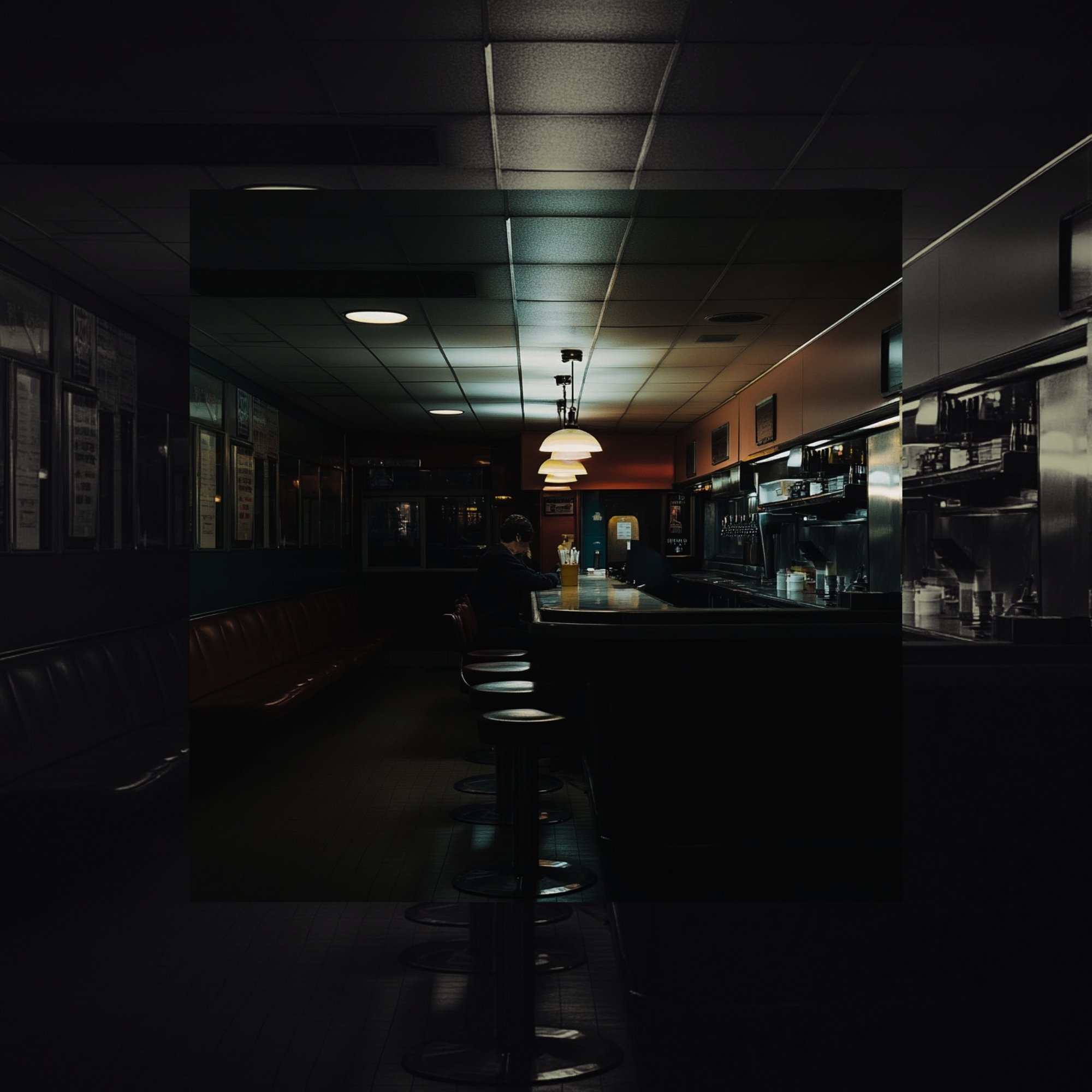 among a quiet flock. Another night, another bright café,